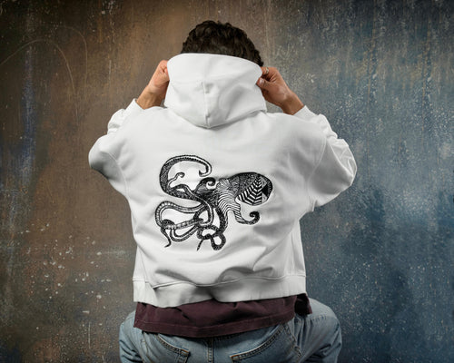 Obsidian Threads — White Heavyweight Hoodie - Octopus